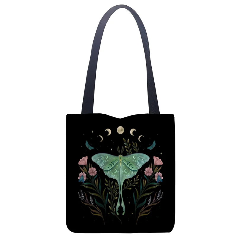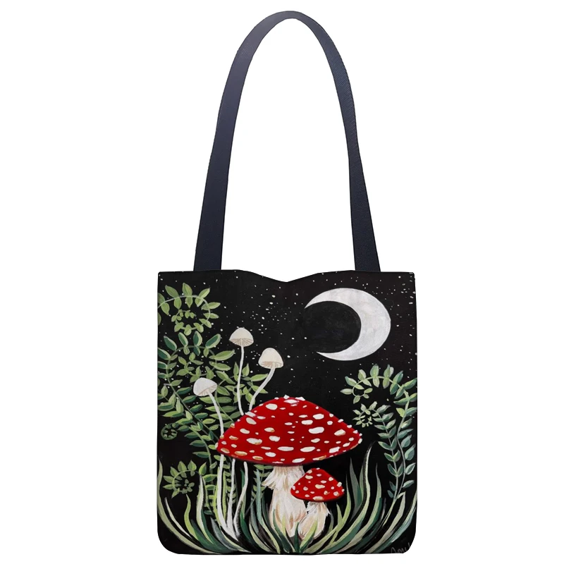 Art Forest Red Mushroom Pattern Tote Bag, Line Bag Bright Moon Women's Handbag