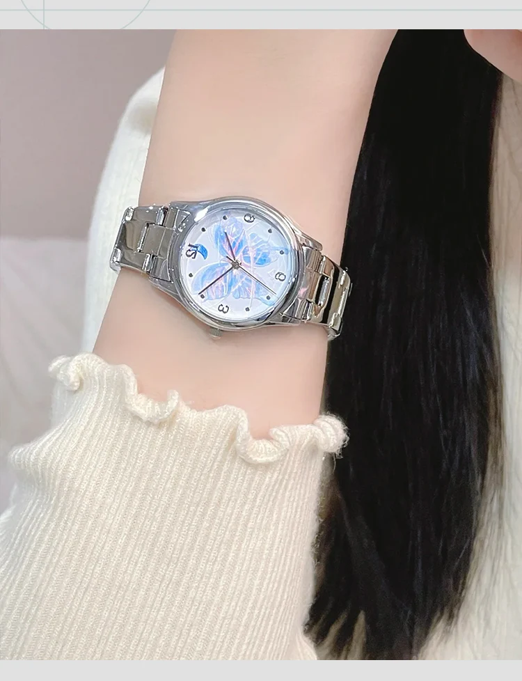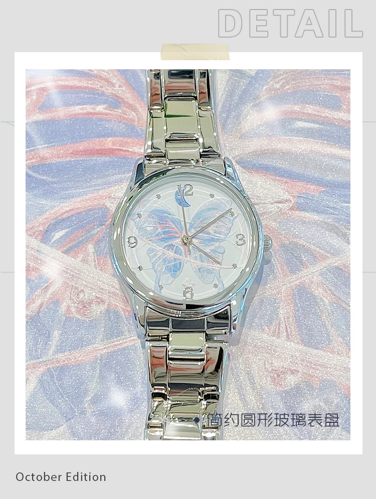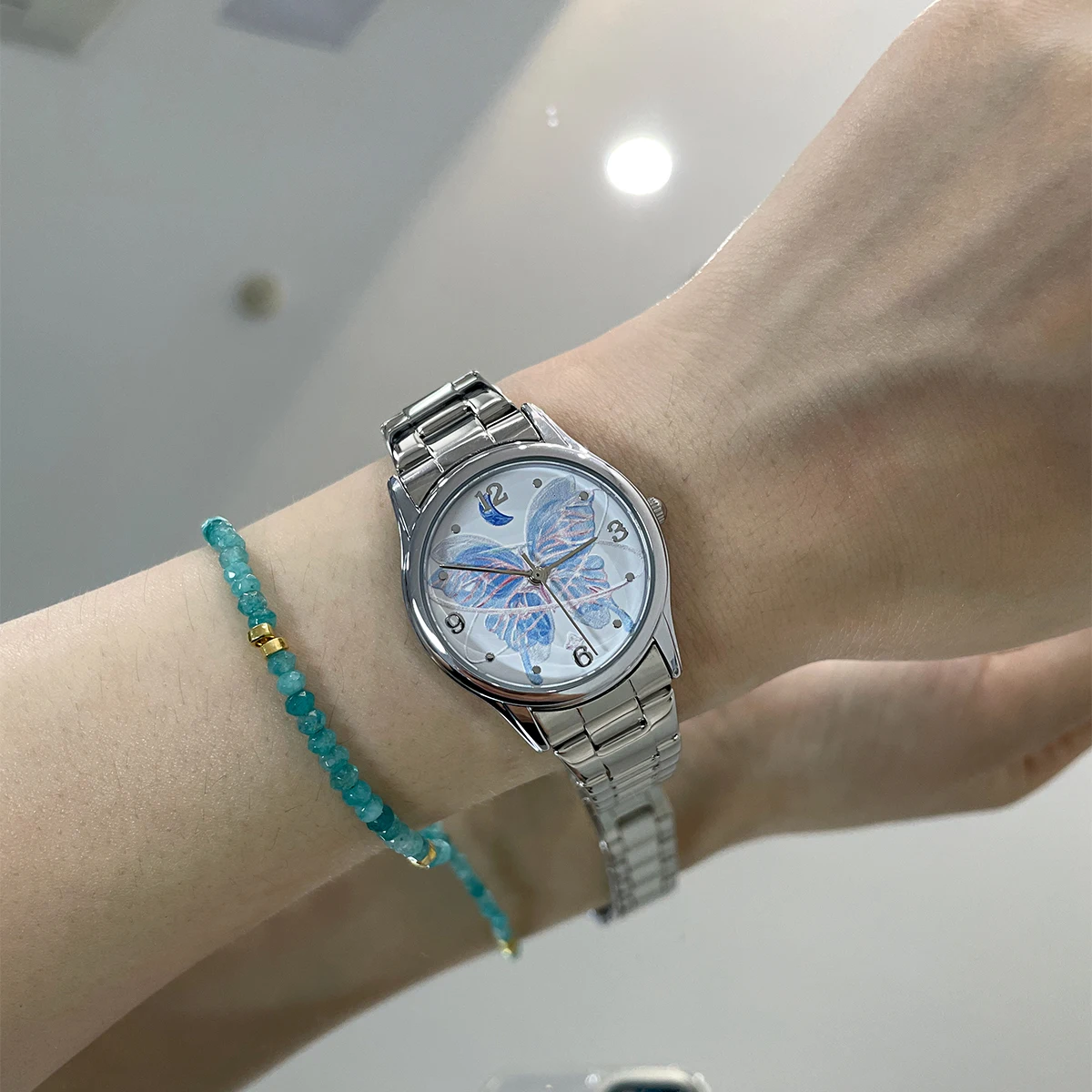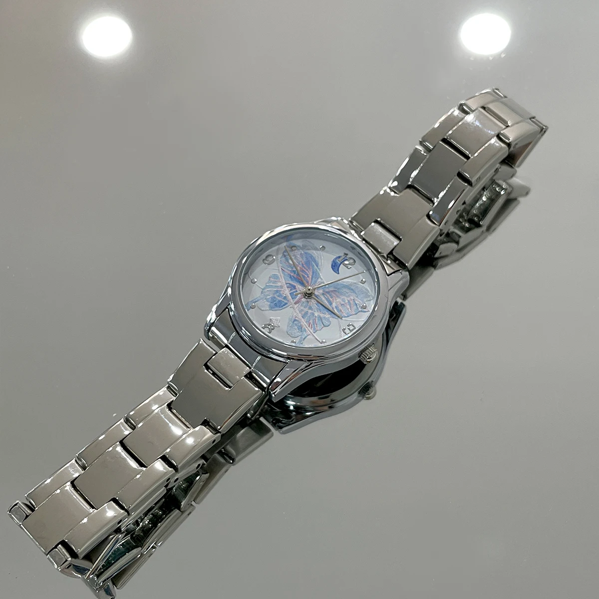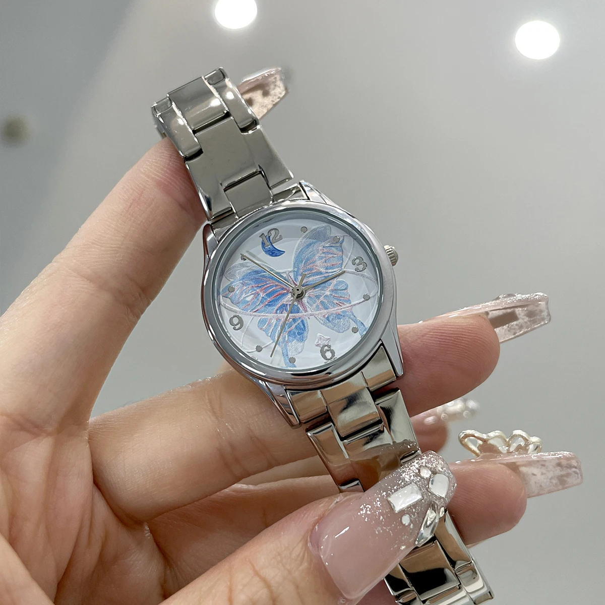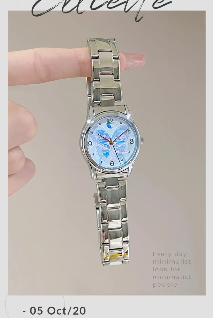 Features: Butterfly fashion exquisite watch, fresh summer watch, round shape, light luxury high-end feeling, double snap button, large dial, high-end atmosphere, fashionable new style, quartz movement, 30 meters waterproof, stable quality, niche watch, suitable for ladies, genuine quartz watch, pointer time display.
