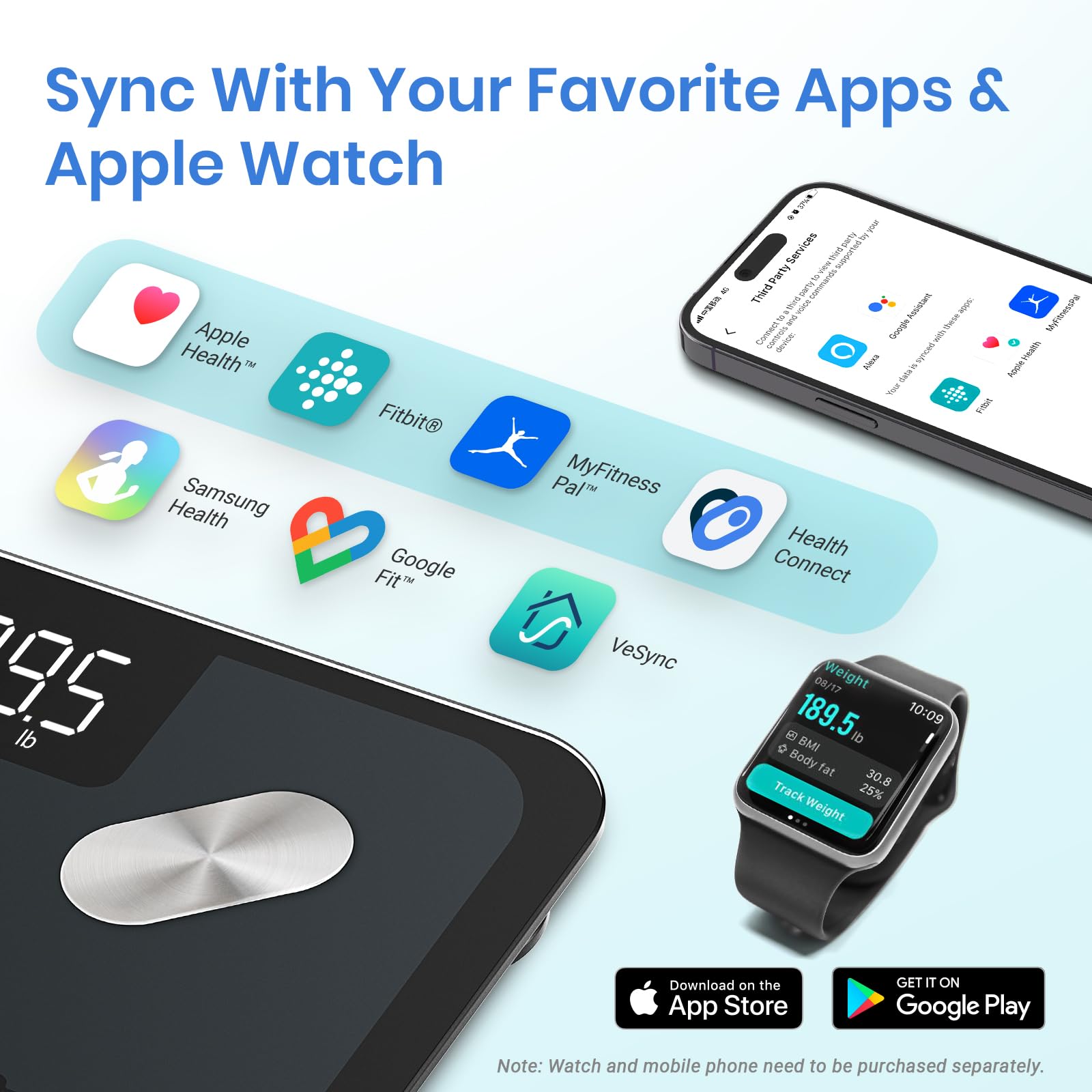 - ๐ผ๐๐ ๐๐๐๐ ๐ฌ๐๐๐: Seamlessly integrate our scale into your fitness routine. Compatible with APPLE WATCH and syncs data with popular fitness apps like Apple Health, Samsung Health, Google Fit, FitBit, and MyFitnessPal. Supports unlimited users for convenience