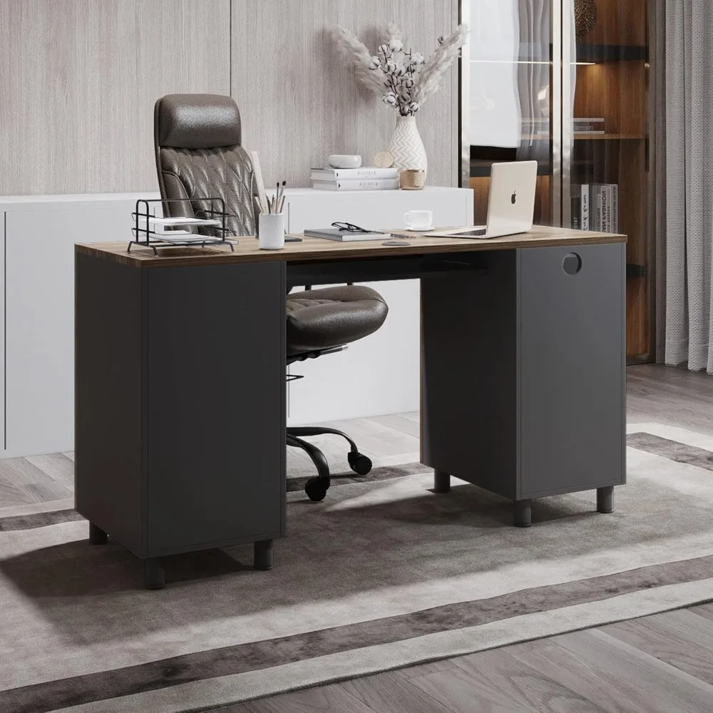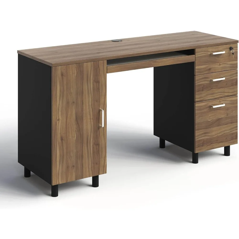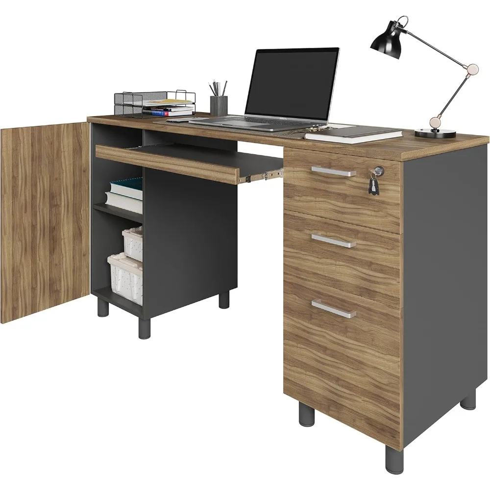 - This desk features a large storage cabinet, a pullout keyboard tray, and 3 lockable drawers that can be locked with one key.