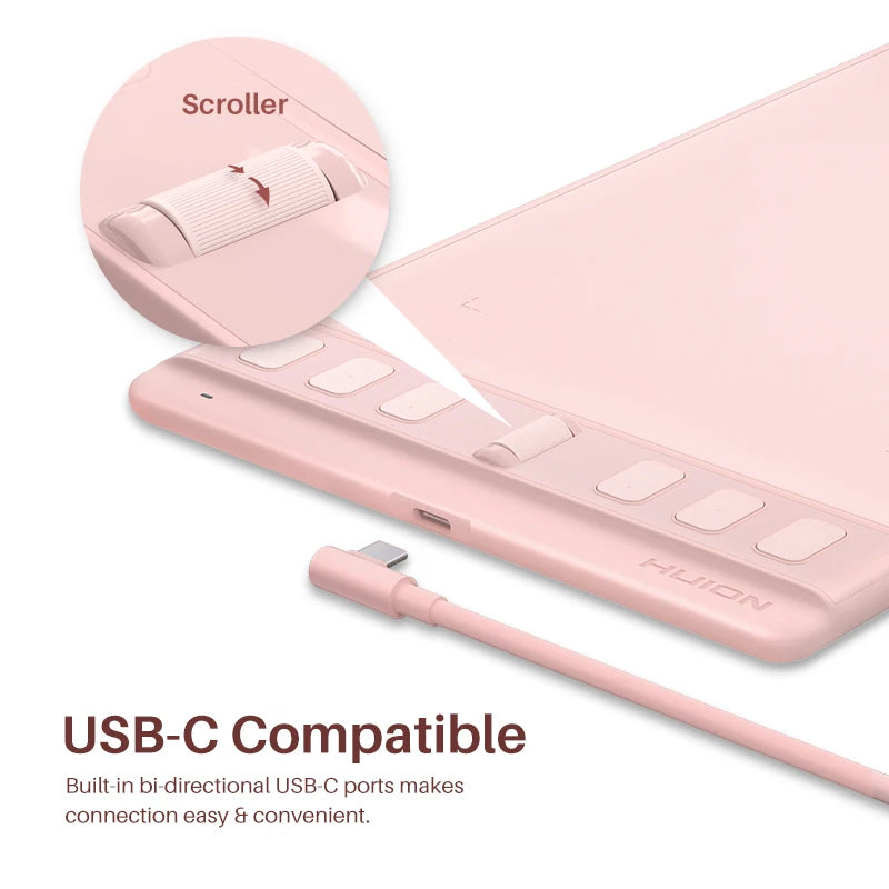 Working area of Inspiroy 2 S: PC Mode is 160 x 100mm (6.3 x 3.9inch), android Mode is 100 x 50mm. Equipped with 6 programmable press keys, you can set different functions. The press keys are much easier to navigate due to the bar height (2mm higher than the drawing surface), the color difference between the press keys and the bar, and the bumps on the press keys. Furthermore, Inspiroy 2 includes a very handy Scroller, sensitivity of whom can be adjusted in the driver, similar to a mouse scroll wheel.
