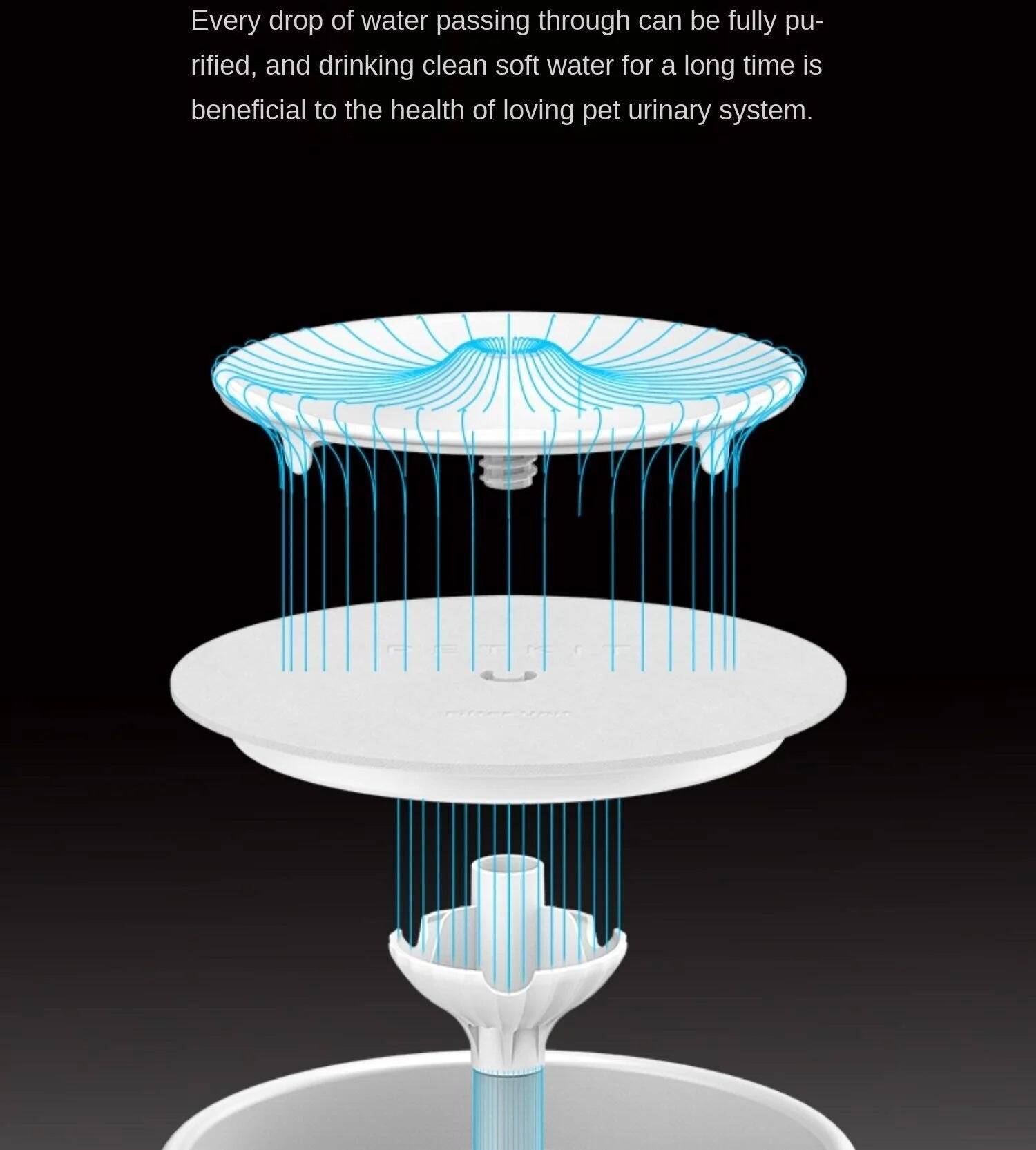 To prevent the activated carbon dust from shedding into water, please soak the cat fountain filter in water for 10 minutes then rinse thoroughly under running water before using. Replace every 1 to 2 weeks in summer and 2 to 4 weeks in winter. If multiple cats are using the fountain, more frequent replacement will be necessary. Please do not forget to reset the device, after replacing the filter.
