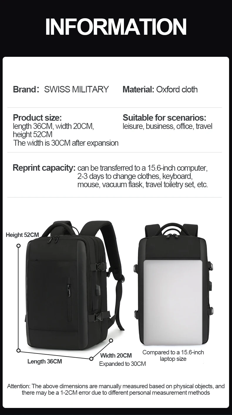 SWISS MILITARY Expandable Men Backpack Waterproof 15.6in Travel Laptop Backpack