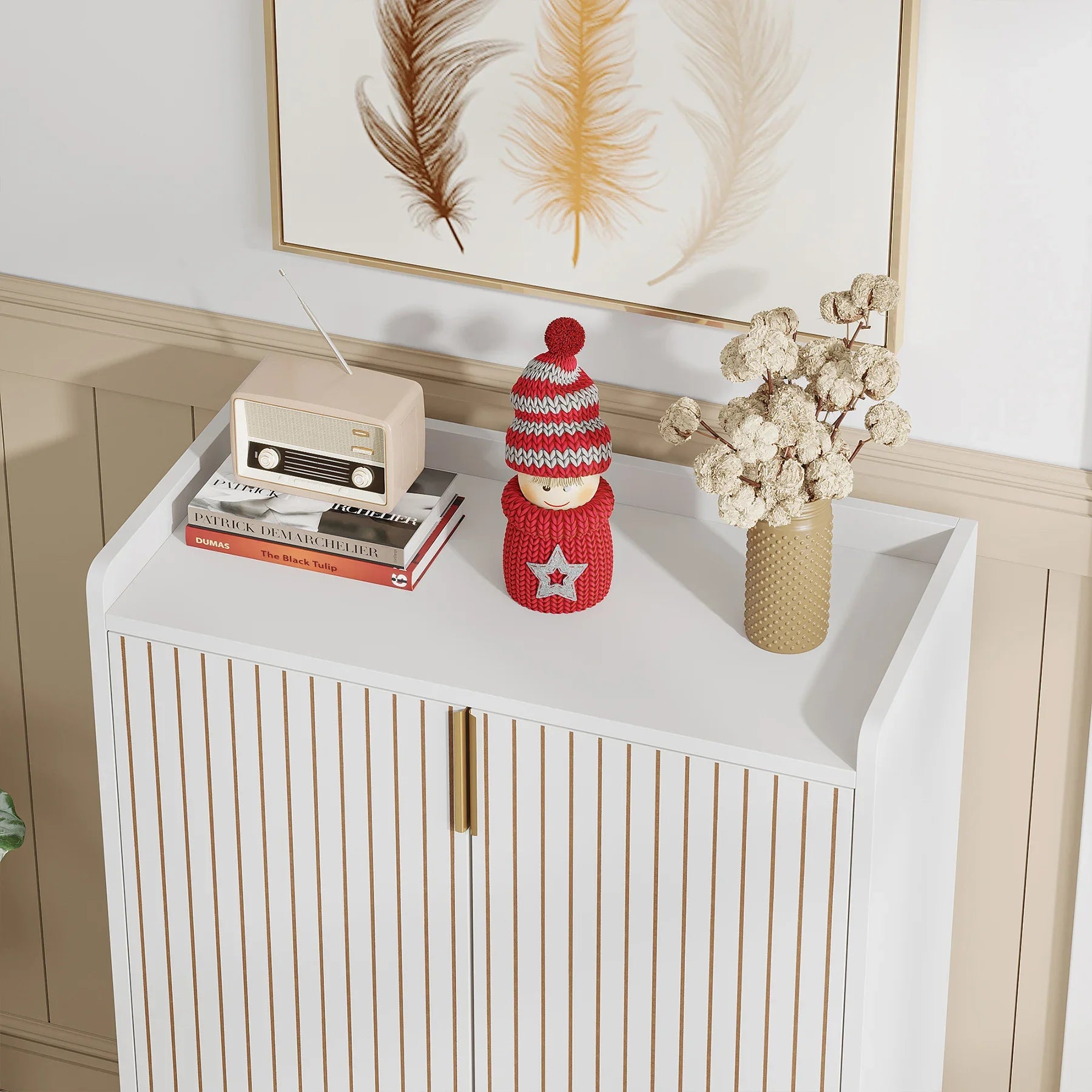 【Versatile, Stylish & Elegant】 - This white shoe cabinet features a minimalist design with a classic white finish and clean lines, seamlessly blending into any room while adding visual appeal. Gold strip accents and a diamond pattern finish provide a touch of low-key luxury, making it a versatile choice for modern homes.