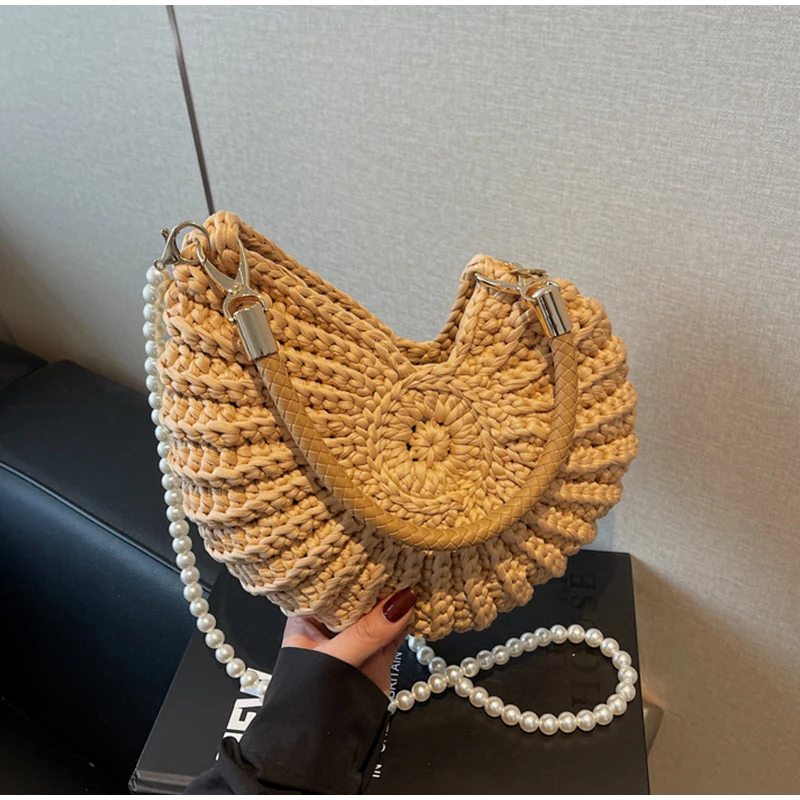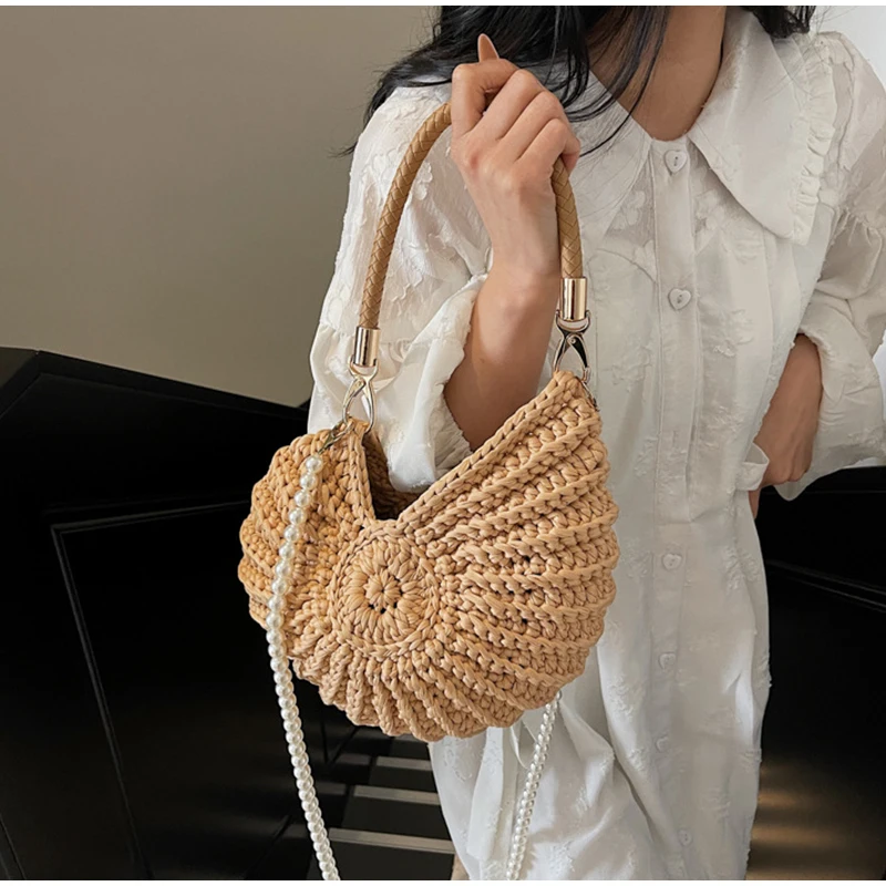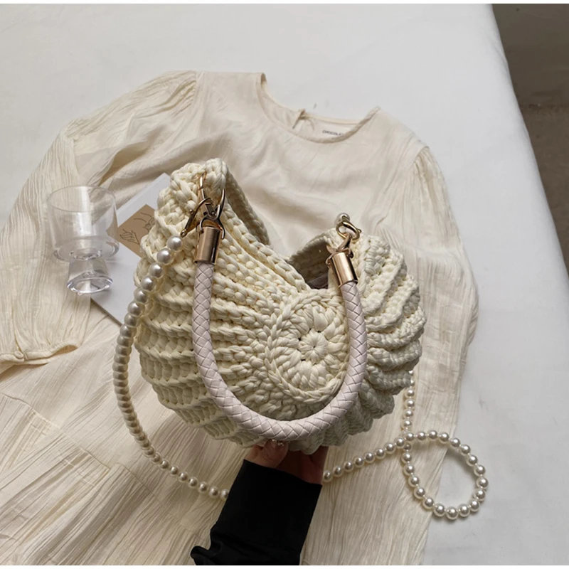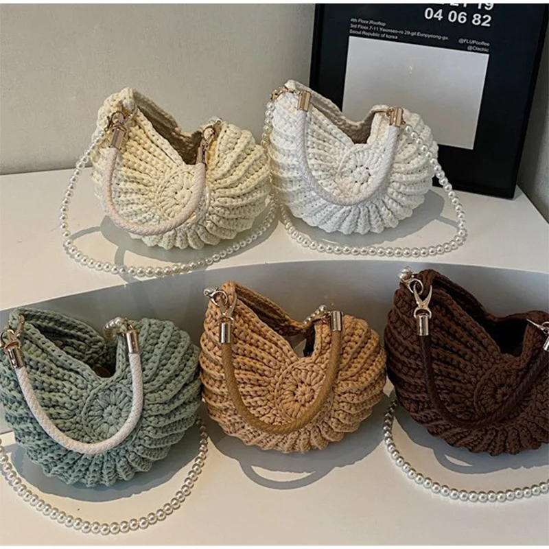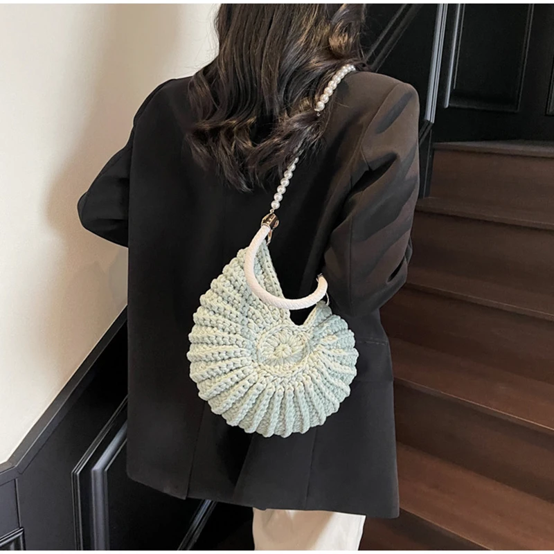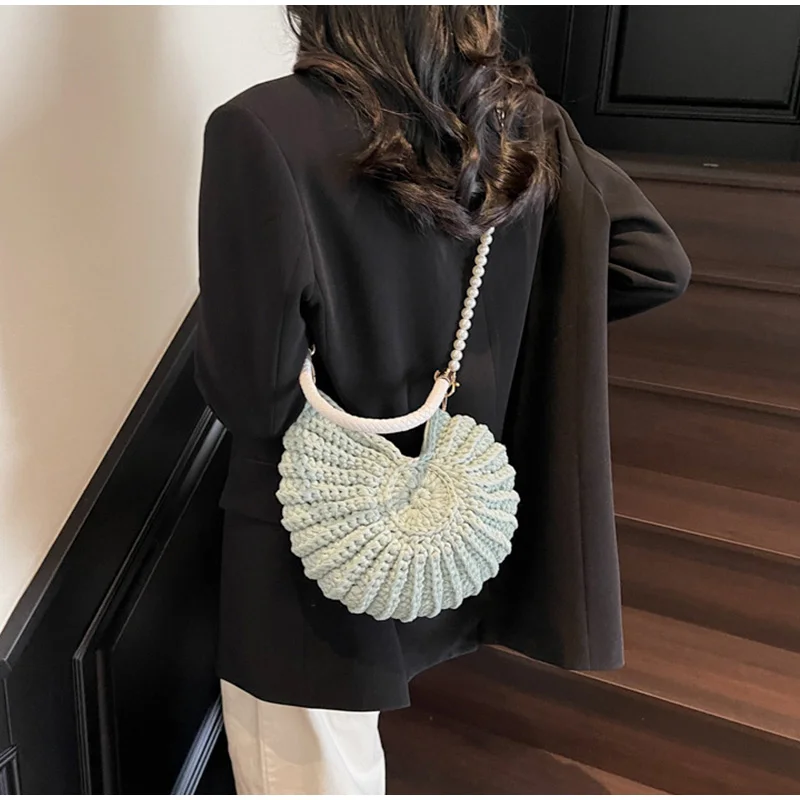Conch Shell Knit Crochet Crossbody Shoulder Bag,Pearl Chain Handmade Woven Women Sling Bag,Elegant Delicate Cute Compact Purse