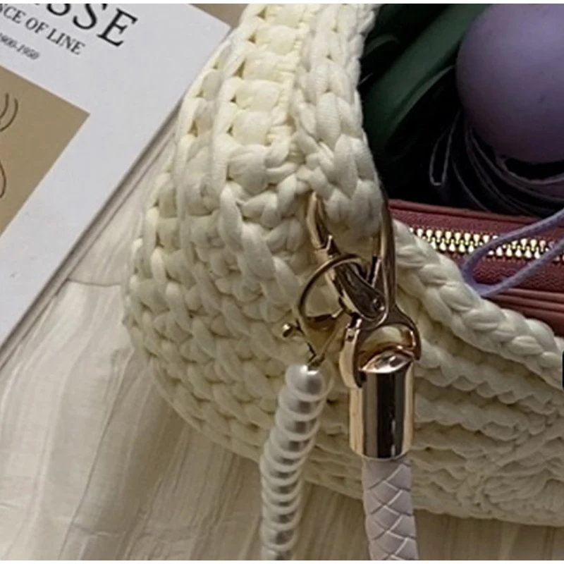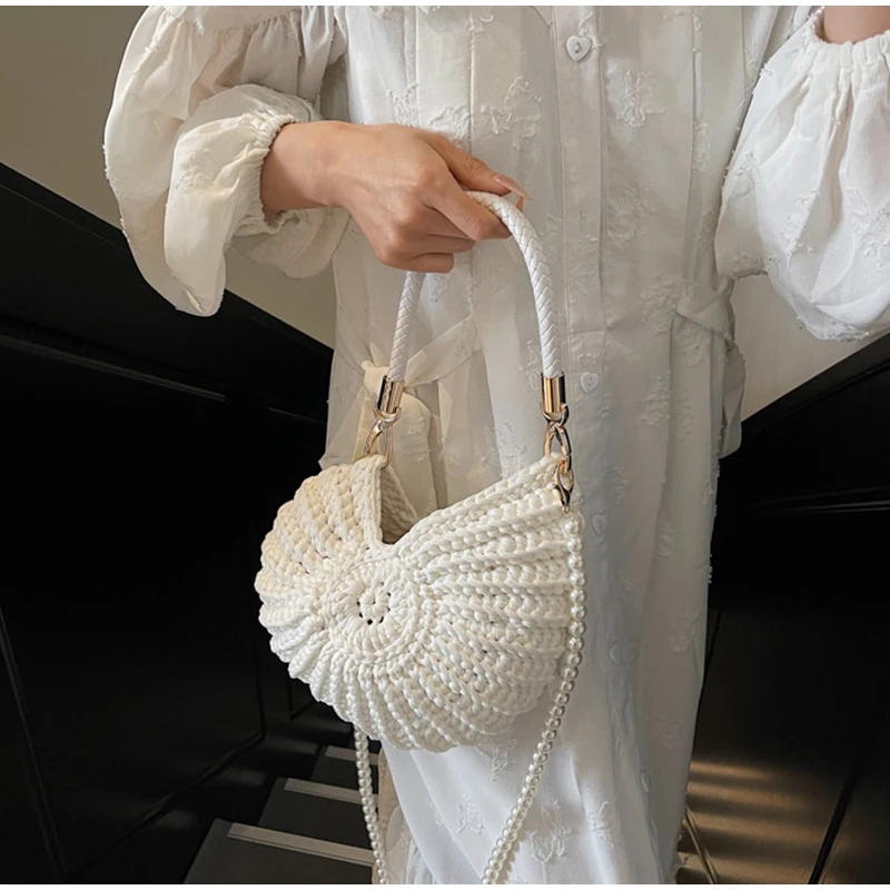 White Conch Shell Knit Crossbody Shoulder Bag Pearl Chain Woven Women Classy Bag