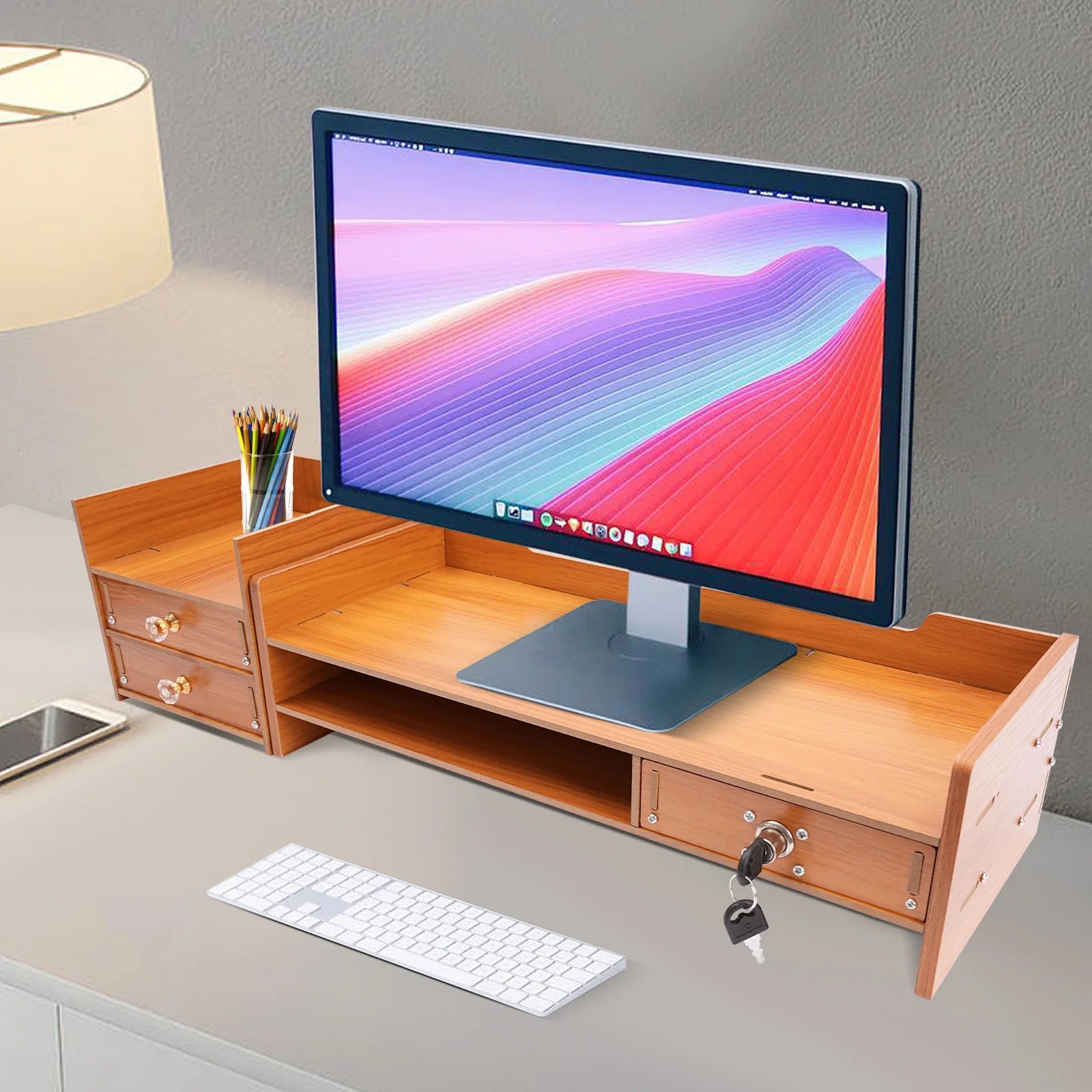 Wood Monitor Stand Riser Computer w/Drawer & Lock, Home Laptop Desktop Organizer